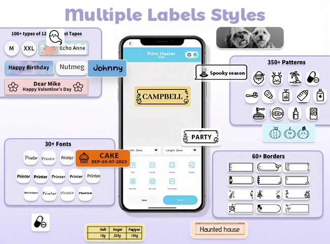 Multiple Creative Function & Convenient Label Templates - Choose from a wide variety of pre-designed templates including 1000+ symbols, 60+ frames, and a variety of fonindividuals, Convenience and saving time. Easy to create various design label stiers from App with Icon, texindividuals, tables, symbols, logos, barcodes, QR codes, images, time, insert Excel, Scan, Ocr, and Voice RECG, it is fun and effortlessly