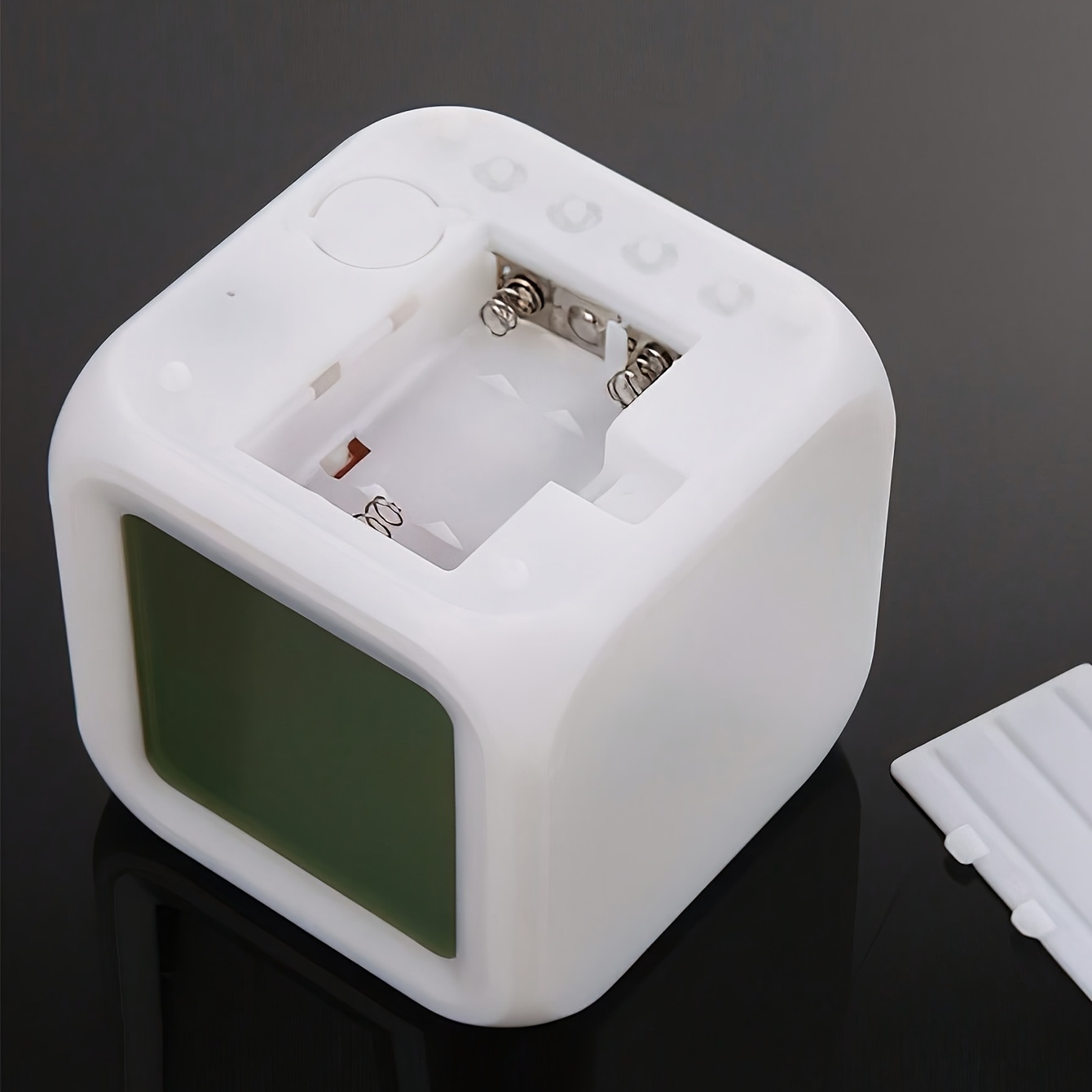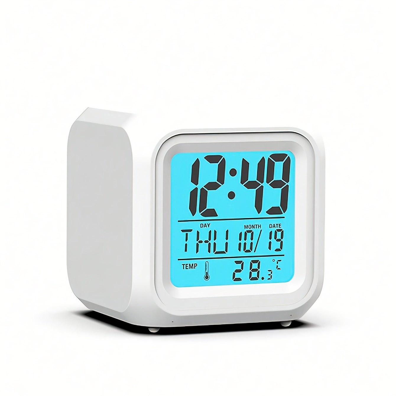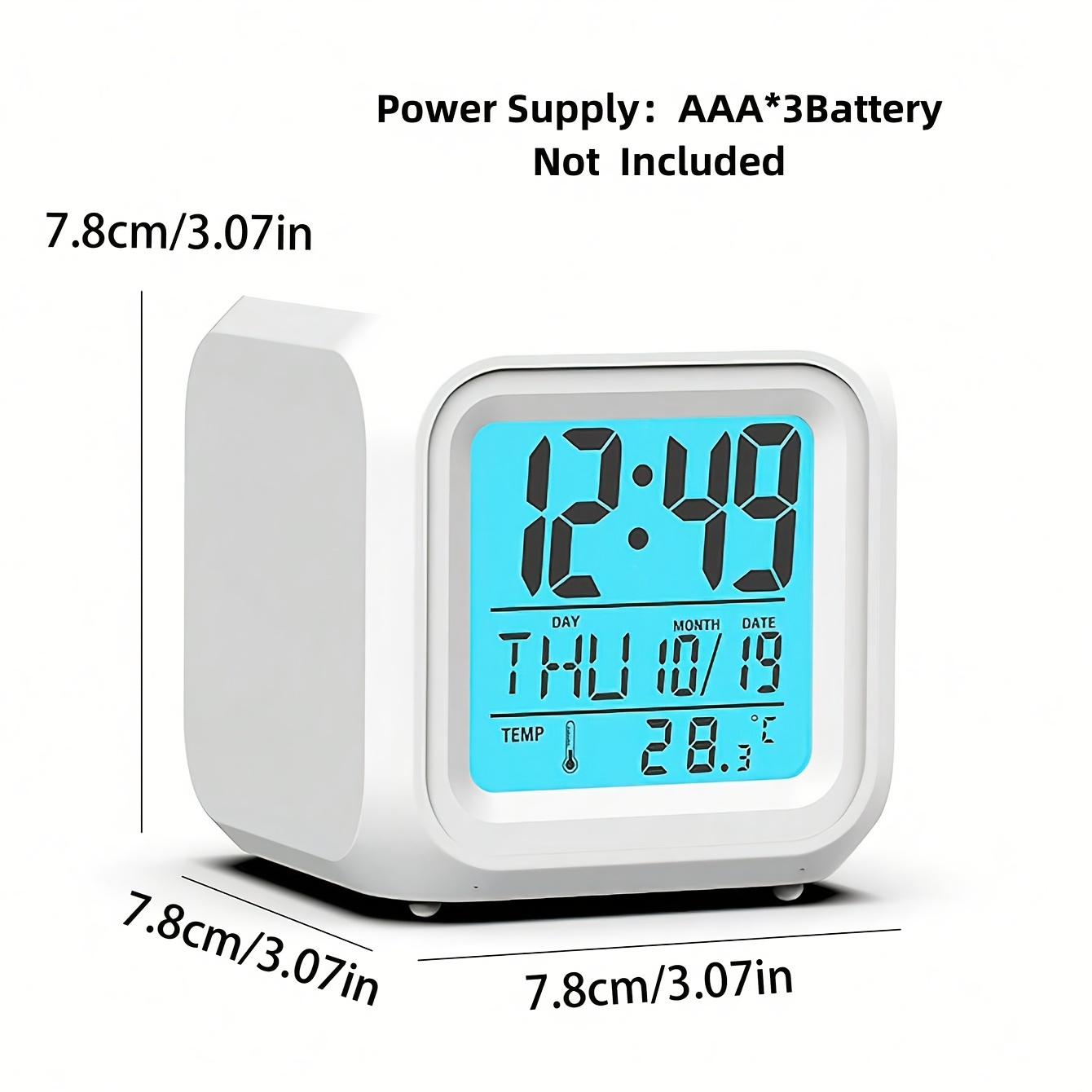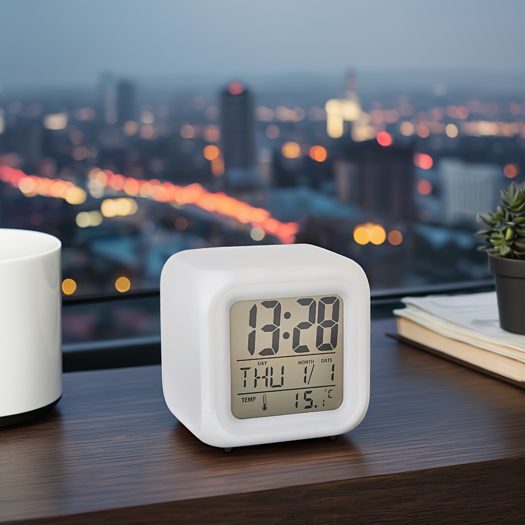 Color-Changing Alarm Clock with Thermometer Silent LED Night Light Date Display Square Battery Powered White for Bedrooms