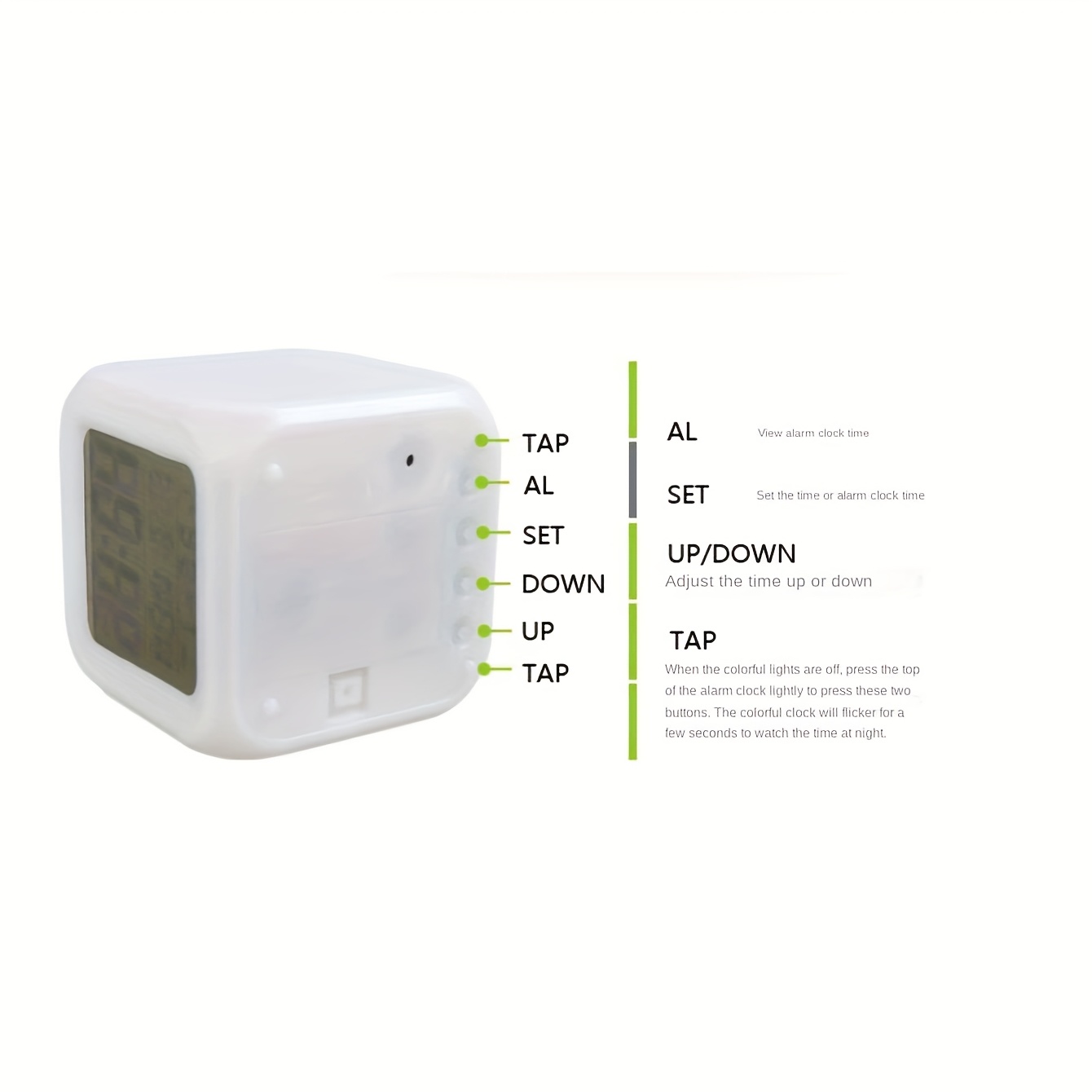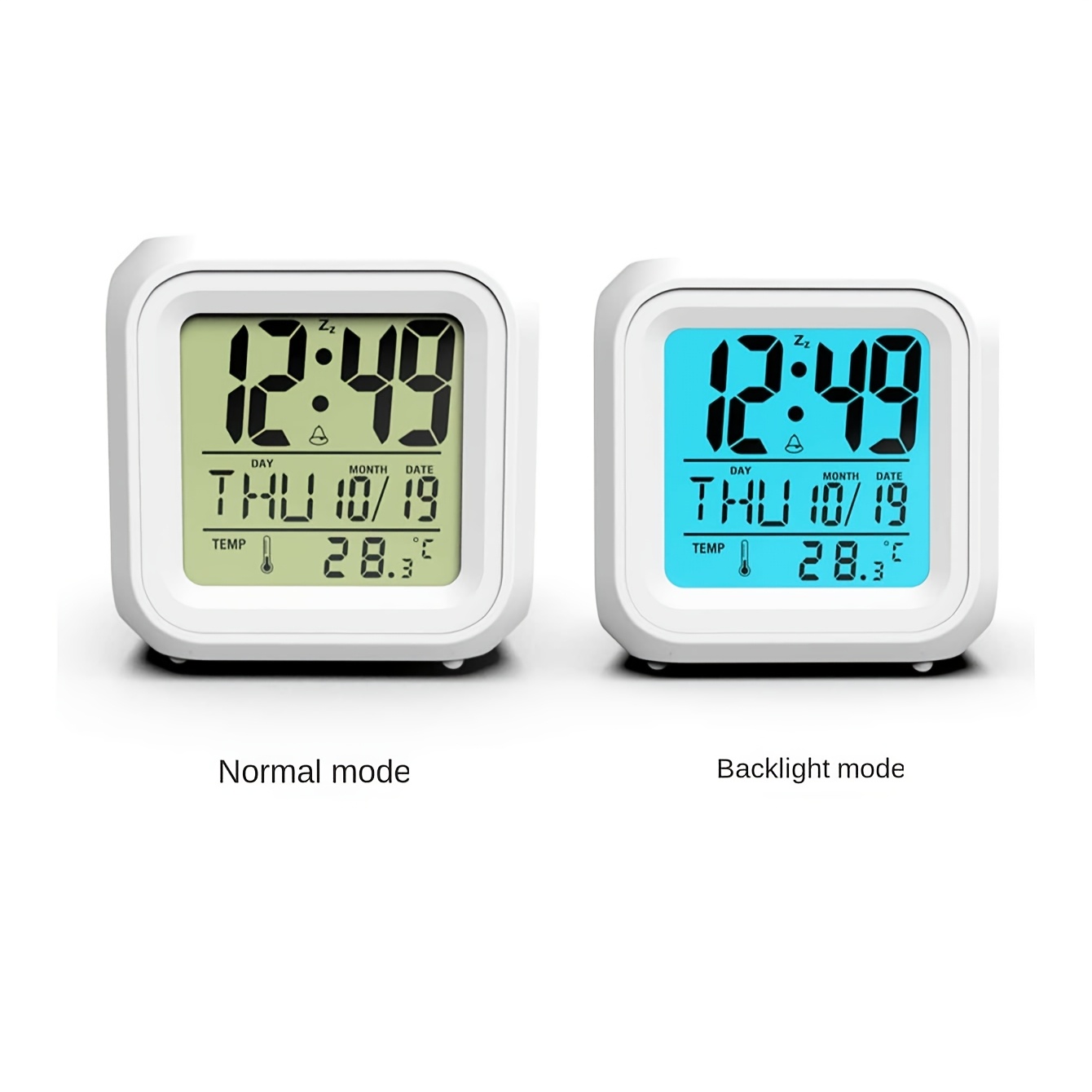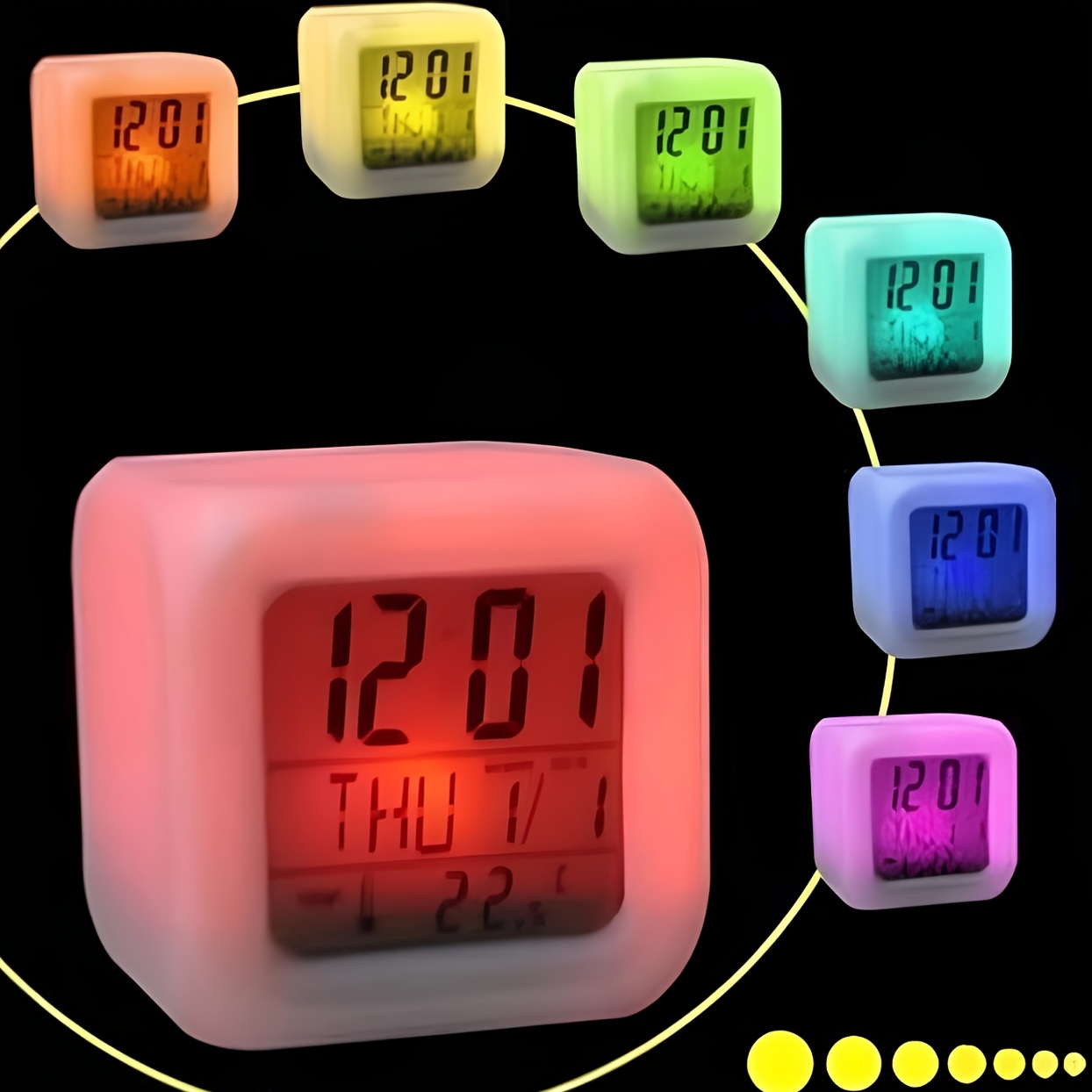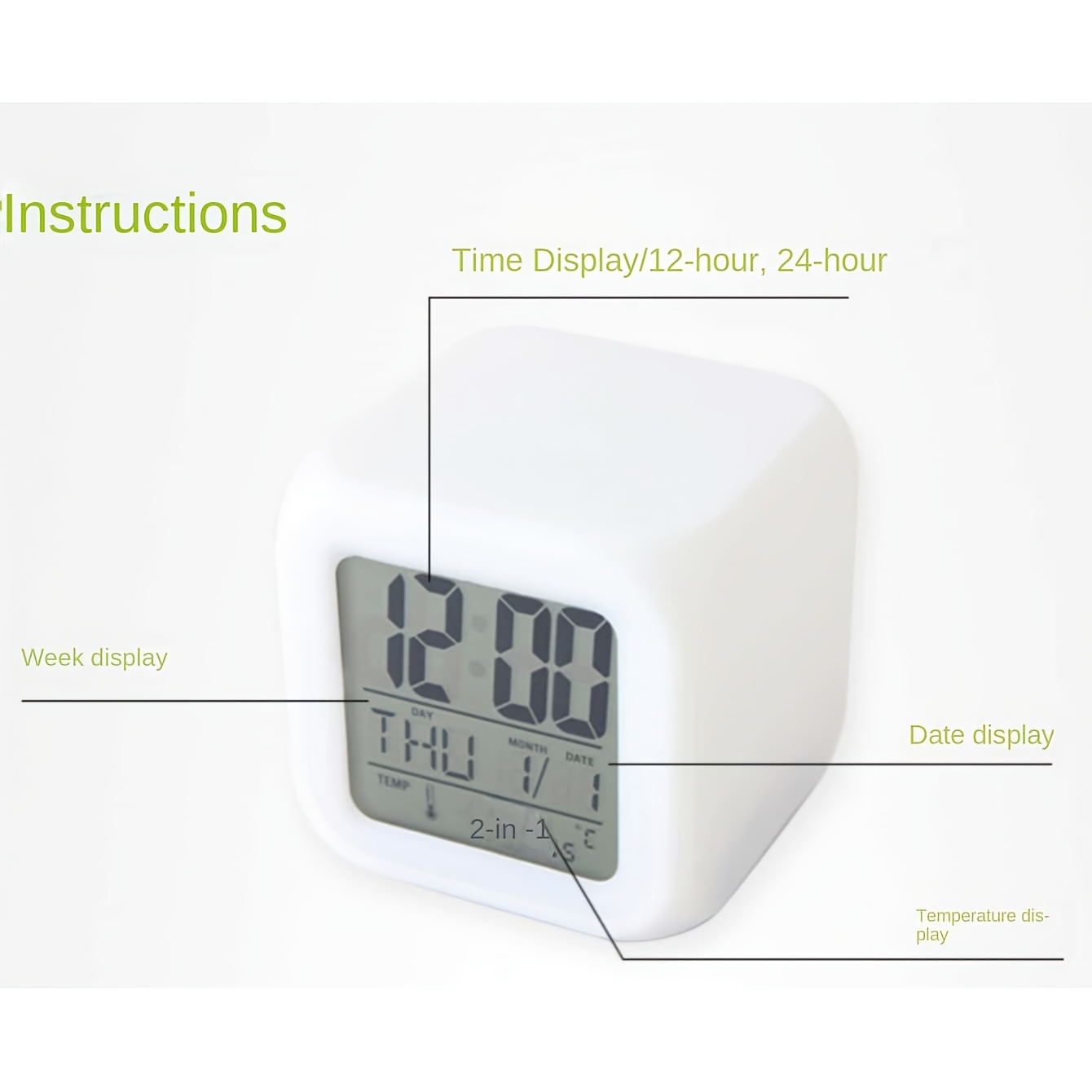 Color-Changing Alarm Clock with Thermometer Silent LED Night Light Date Display Square Battery Powered White for Bedrooms