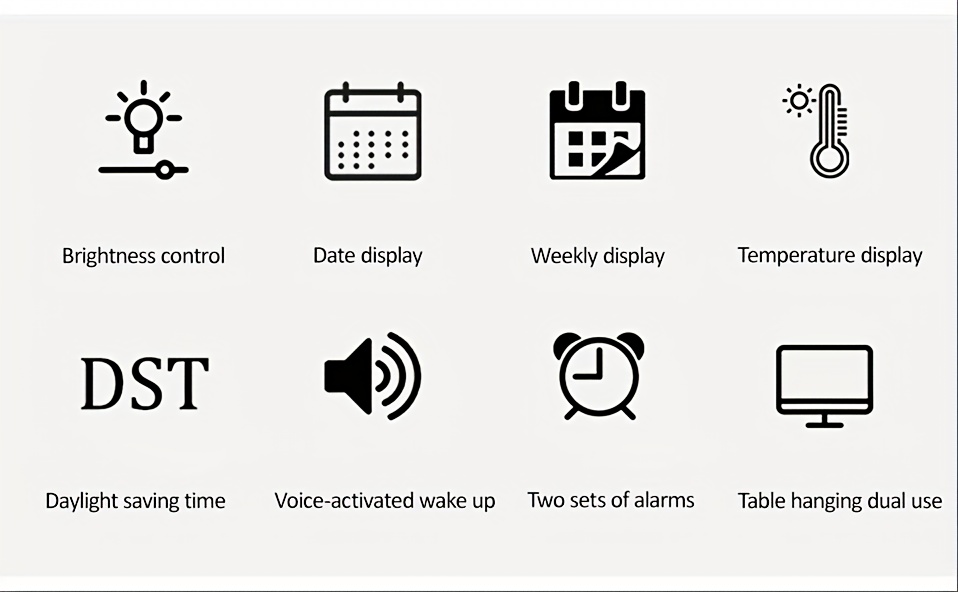 Function1. Time/Date/Temperature /Week Display2. Dual Alarm clock functionSupport to set Alarm frequency:1-5/1-6/1-71-5:Alarm rings from Monday to Friday1-6:Alarm rings from Monday to Saturday1-7:Alarm rings from Monday to Sunday3. Brightness adjustment4. Time memory function5 Levels manual brightness adjustment and auto-sensingAvailable when powered by battery and plug in use at the same time